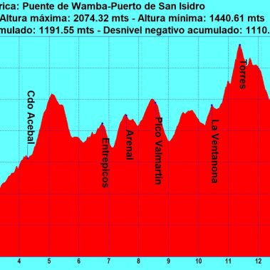 Continuaremos descendiendo por una fuerte pendiente para volver a subir otra vez para llegar a la cima de la Peña del Viento (1.992 m). Buzón. Descenderemos por un sendero en dirección al Collado del Acebal, aunque antes podremos ascender a la Peña de los Fornos (1.928 m). Del collado Acebal tomaremos una pista (S) por donde caminaremos a lo largo de 4 km para llegar al Puente de Wamba, lugar donde nos estará esperando el Bus.