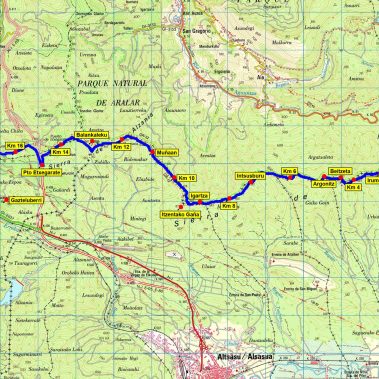 La etapa se inicia en la Casa del Parque. Desde allí se debe avanzar unos cien metros por la carretera NA-120 hacia el Este y tomar un desvío que da acceso a una casa. En ese punto parte un sendero que comienza a ascender a través de un hayedo. Durante 1,5 km se ascienden 300 m de desnivel a lo largo de un sendero forestal con pendientes muy pronunciadas —hasta el 30%— que zigzaguea por la ladera del monte Askoa, hasta coronar en las proximidades del pico Txaradigorri.