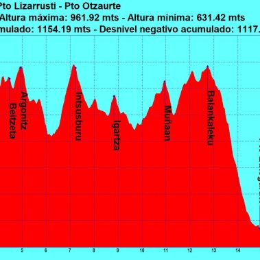 Ver álbum fotográficoTravesía que transcurre por las provincias de Gipuzkoa y Navarra desde el Puerto Lizarrusti hasta el Puerto Otzaurte para ascender a las siguientes cimas: Txaradigorri (994 m) Intsusburu (945 m) – Balankaleku (985 m)
