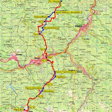 Travesía que transcurre por Gipuzkpaa para realizar la 5ª etapa GR-121 Vuelta a Gipuzkoa desde el Puerto de Urkarregi hasta Elgeta con la opción de ascender a las siguientes cimas: Kalamua/Maaxa (771 m) – Akondia/Arrikurutz (749 m) – Topinburu (596 m) – Azkonabieta (728 m).