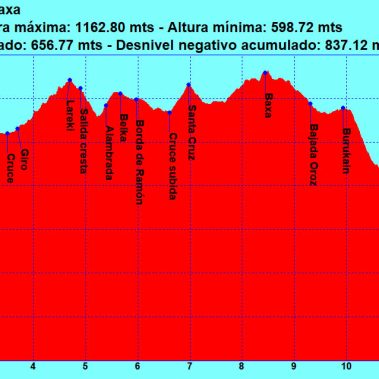 Para buscar la bajada a Oroz Betelu retrocedemos hasta pasar el Morro de Itxarri (cima oriental del Baxa) y poco antes de llegar de nuevo a la campa del collado de Santa Cruz cogemos el sendero que con fuerte giro a la izquierda (NO) nos encamina dirección Oroz Betelu. En menos de 1 km pasamos por la modesta loma de Burukain (1.082 m), afrontando un descenso que en unos 3 km nos lleva hasta la carretera que baja de Azparren a Oroz; la seguimos 500 m para llegar al parking donde estará el bus.