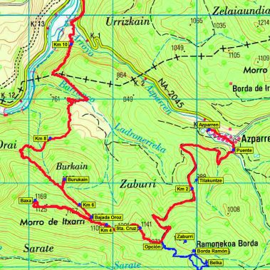 Itinerario: La ruta parte junto al cementerio de Azparren (810 m), localidad del Valle de Arce cercana a Oroz Betelu. En sentido SE llegamos al puente que salva la regata Intxusta. Siguiendo por el camino de Bizkai entre hayedo y pinar, en unos 3 km llegamos al collado de Itxarri (1.070 m), donde giramos a la derecha salvando un árbol caído.
