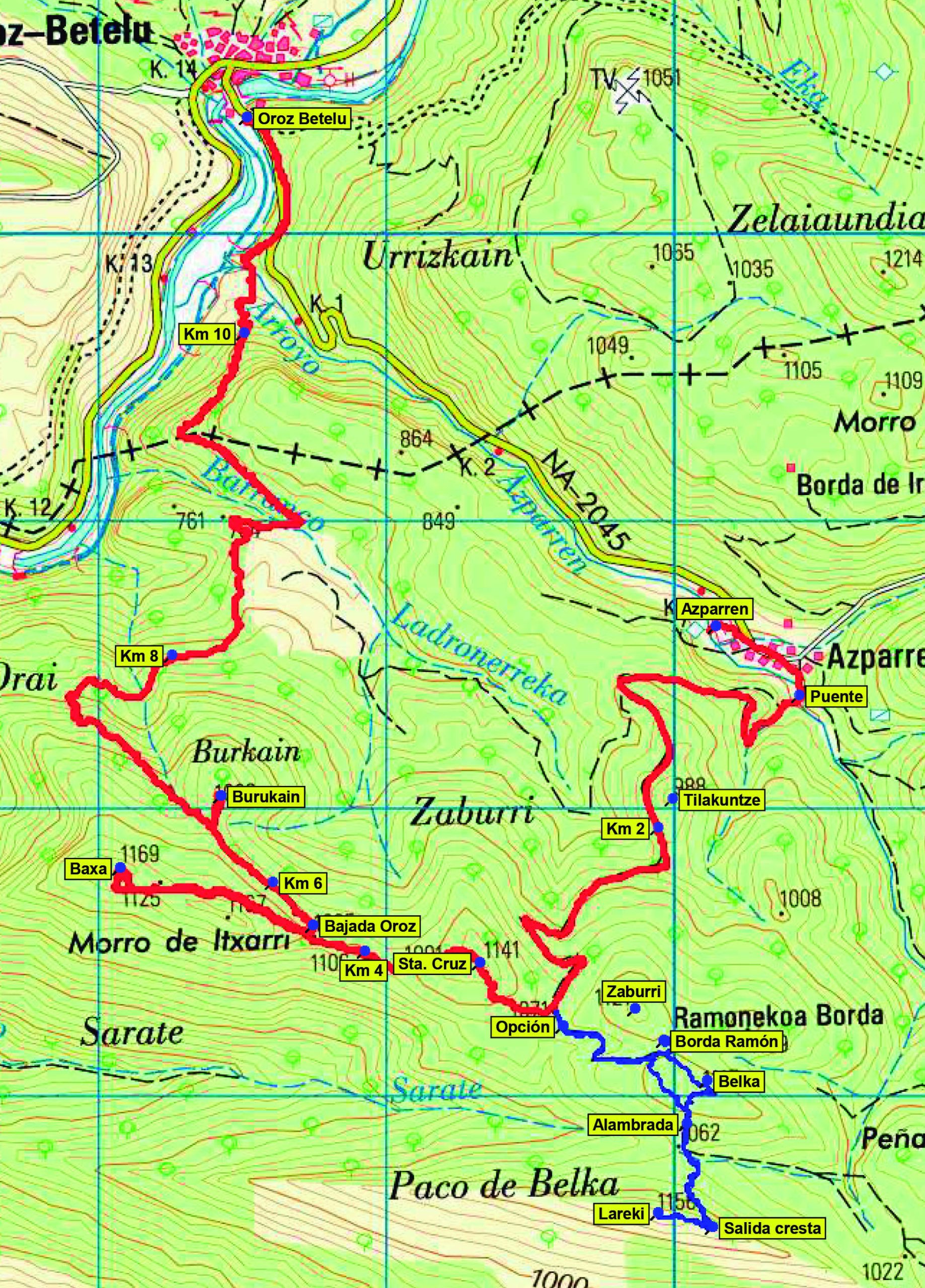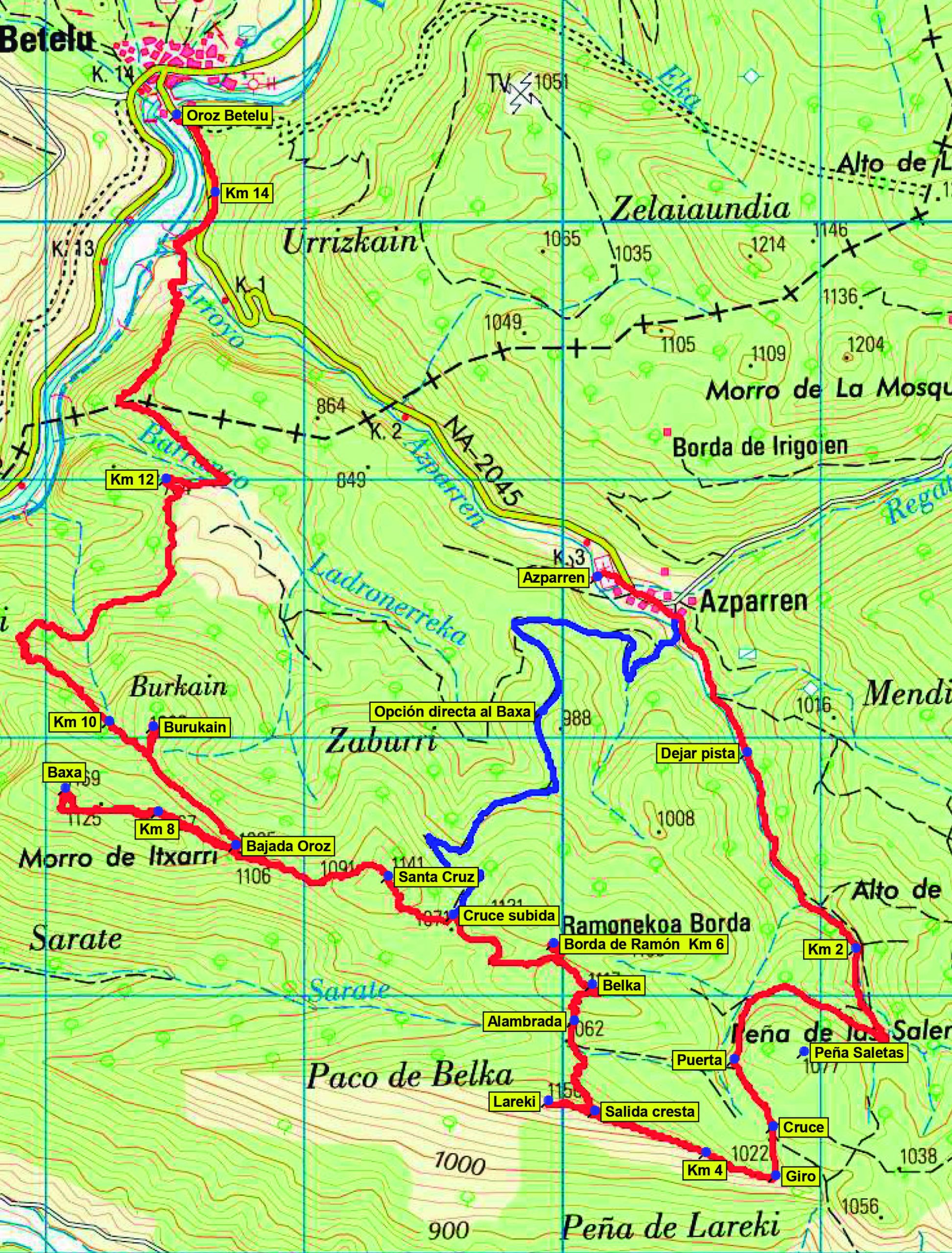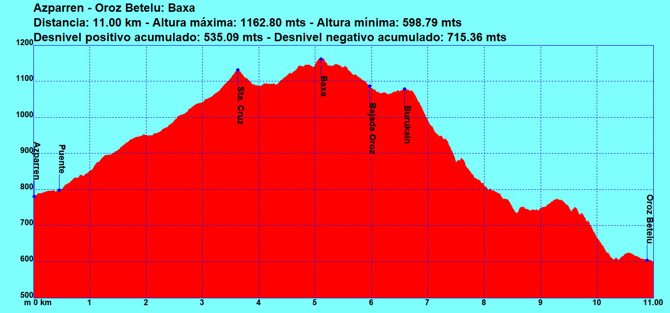 Para buscar la bajada a Oroz Betelu retrocedemos hasta pasar el Morro de Itxarri (cima oriental del Baxa) y poco antes de llegar de nuevo a la campa del collado de Santa Cruz cogemos el sendero que con fuerte giro a la izquierda (NO) nos encamina dirección Oroz Betelu. En menos de 1 km pasamos por la modesta loma de Burukain (1.082 m), afrontando un descenso que en unos 3 km nos lleva hasta la carretera que baja de Azparren a Oroz; la seguimos 500 m para llegar al parking donde estará el bus.