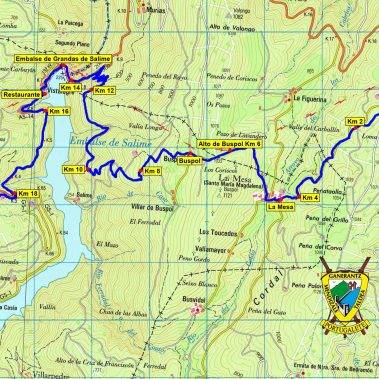 Km 14,5. Embalse de Salime (Hotel-Bar-Restaurante 1 km después). La AS-14 va a guiar nuestros pasos durante los próximos 4,5 kilómetros. Un kilómetro más adelante pasaremos junto al Hotel Las Grandas, situado en el lugar de Vistalegre. Dejaremos pasar los kilómetros de asfalto abstraídos por el entorno y, unos 200 metros pasado el desvío a Pénjamo, abandonamos la AS-14 por la izquierda. El arreón que propina una vereda muy empinada da paso a una bucólica senda boscosa que lleva hasta Grandas de Salime. Tomando el primer desvío a la derecha entramos por la avenida del Ferreiro, junto al Museo Etnográfico, y alcanzamos el Ayuntamiento, donde se encontraba el antiguo albergue. Para dirigirse al actual hay que tomar a la derecha la Avenida de la Costa (AS-12).
