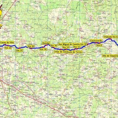 Km 15. Vilar de Cas (Máquina de refrescos y snacks), A la salida cabe la posibilidad de visitar Soutomerille y su iglesia de San Salvador, joya del prerrománico restaurada durante el barroco que aún cuenta en el ábside con una ventana de la obra primitiva. El rodeo supone 800 metros adicionales y no hace falta regresar a este punto sino que enlaza un poco más adelante con el itinerario oficial. Éste prosigue de frente hasta una cantera en horas bajas y cruza el río Romeán, también tributario del Miño, tras pasar las casas de A Pallota, última entidad de la parroquia de Moreira y del Concello de Castroverde. Desembocamos en la LU-P-2917 y subimos por ella hasta Gondar, primera parroquia del Concello de Lugo.