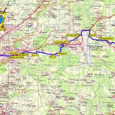 Por pista asfaltada iniciamos una cómoda subida que finalizará en el esperado Monte do Gozo. Atravesamos primero Villamaior, pasamos junto al centro de la TVG y giramos 90 grados a la izquierda para hacer lo propio junto al centro territorial de RTVE. Giramos noventa grados a la derecha y continuamos hasta la urbanización San Marcos, antesala del Monte do Gozo.