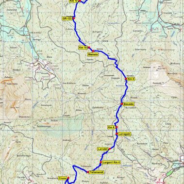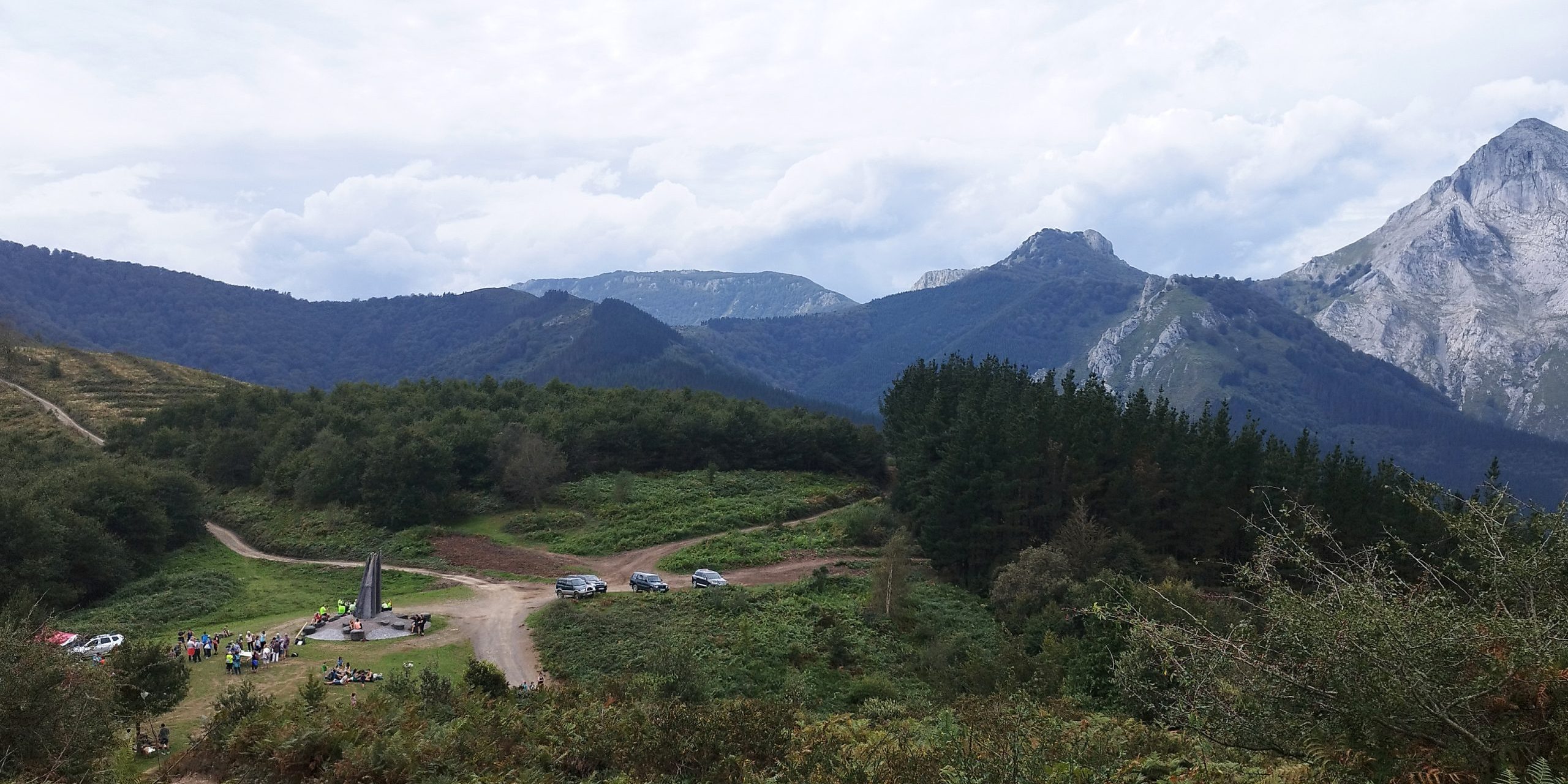 Giraremos a la derecha y en poco más de 10’ llegaremos a la cima del Tellamendi (835 m) Gran Cruz Metálica, Buzón Montañero y Vértice Geodésico. Continuaremos descendiendo por el cordal para seguidamente coronar el Lurgorri (788 m). Seguiremos en fuerte descenso en zig zig hasta llegar cerca de una Borda. Continuaremos por buena pista y durante el recorrido nos podremos salir de ella para ascender al Larrabil (668 m) y el Larragain (669 m) antes de llegar al Besaide (555 m) punto de encuentro de las tres provincias vascas, en él se hayan 2 monumentos; cuatro pilares verticales unidos, obra del japonés Yoshin Ogata y unos metros más arriba, una torre con una cruz, que hace homenaje a los montañeros fallecidos. Al lado, se haya el buzón cimero y un geodésico.