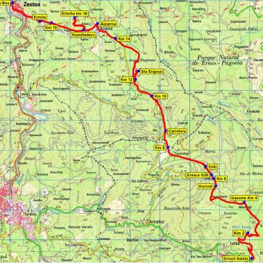 Un camino pisado tallado en la roca nos lleva en pocos minutos al espléndido mirador del Santa Engrazia (507). Buzón Montañero. Esta rocosa punta alberga la ermita de Santa Engrazia que se remonta al año 1.526. Hubo otra ermita anterior que fue destruida por un rayo, de la que se conserva la portada en arco ojival. Descenderemos por el mismo camino, retomando la ruta por senderos hasta que entremos de nuevo en la carretera, que nos llevará hasta Aizarna, fuente con agua en la plaza. Ahora buscaremos el camino de la PR que nos lleve a Zestoa.
