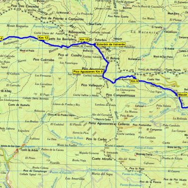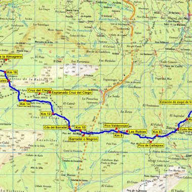 Desde el Cuito Negru empezaremos a seguir el cordal por una ancha pista, la cual abandonaremos en el Alto de Carbajal (1.843 m) para posteriormente ascender al Pico La Carbajosa (1.868 m). Continuaremos el camino descendiendo hasta el collado de las Rubias (1.678 m). Volveremos a ascender para llegar a la cima del Valdeovejas (1.776). Nota: Estos picos se pueden rodear a media altura sin necesidad de hacer cumbre