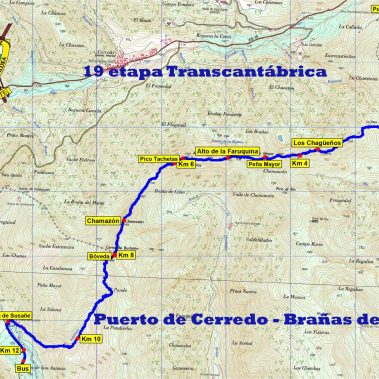 Descenderemos un poco hasta un collado para seguidamente ascender al PicoTres Concejos (2.014). Ahora toca un fuerte descenso caminando entre brezos buscando el mejor sendero y pasando por los Carriones (1.794), para llegar al Collado Propinde (1.583 m). A continuación, giraremos dirección Oeste para seguir el cordal. Después de un repecho pasaremos por el Pico Chagüezo (1678 m). Siguiendo el cordal iremos pasando por el Collado Bustavide (1.699 m) y por los Pico Llana Cavada (1.795 m) y Pico la Solana (1.911 m).