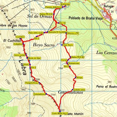Bordearemos por detrás la instalación y viraremos O-SO en busca de una zona rocosa, por la que, a través de un Paso entre rocas accederemos a una pradería (Sel de Ormas) desde la que ya veremos los primeros hitos que nos marcarán la ruta de ascenso hasta el Cuchillón (2.174 m). Retrocederemos y continuaremos por el cordal bien marcado con hitos para ascender al Monte de Hijar (2.092 m)