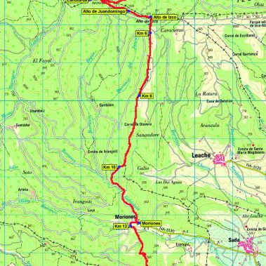 Desde este Alto de Izko la ruta da un giro de 90º a la derecha (S) para afrontar un largo descenso por el cordal (al principio suave) durante 6 km hasta bajar a la aldea de Moriones (510 m), ya en el km 12.