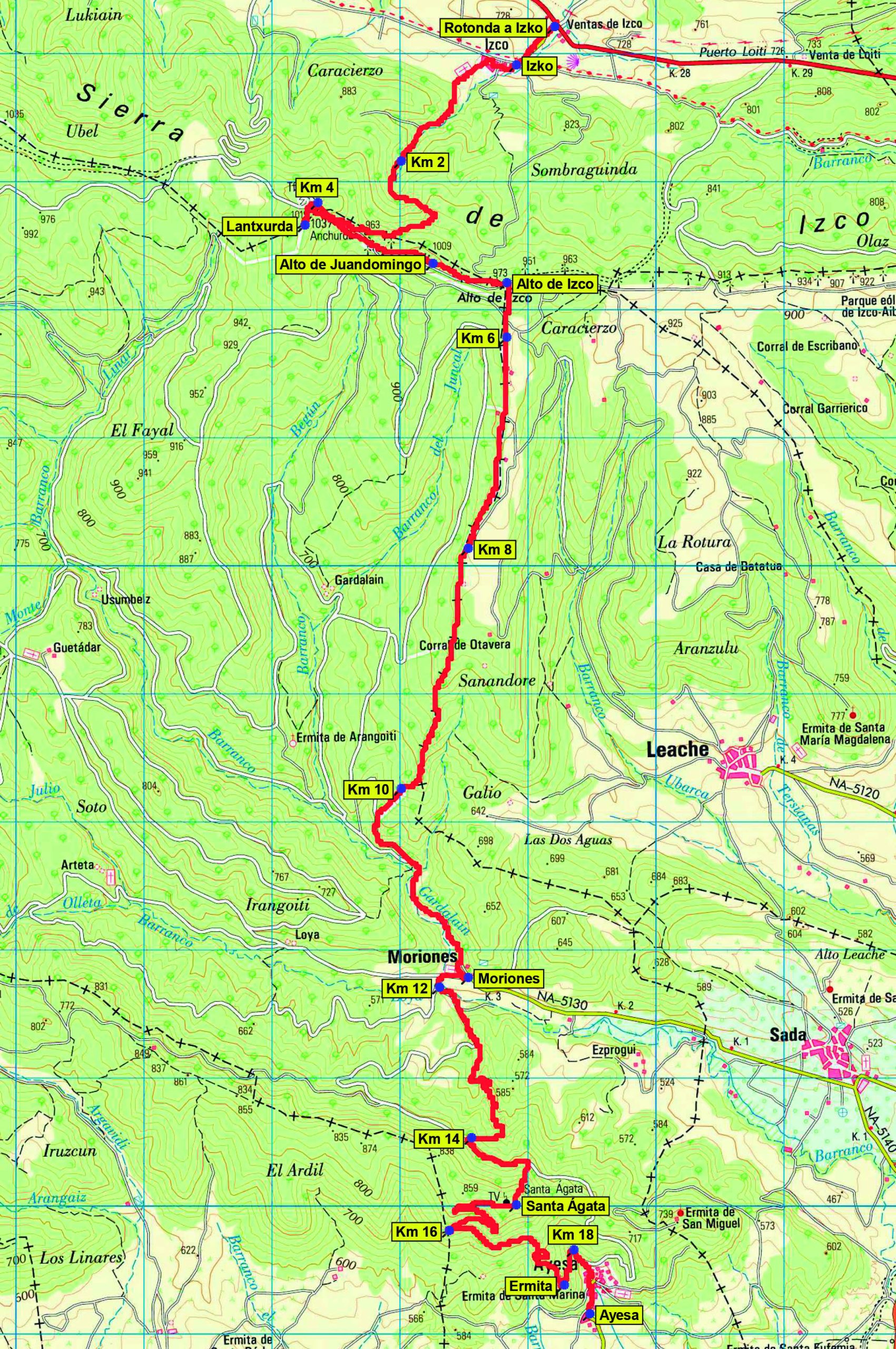 Desde este Alto de Izko la ruta da un giro de 90º a la derecha (S) para afrontar un largo descenso por el cordal (al principio suave) durante 6 km hasta bajar a la aldea de Moriones (510 m), ya en el km 12.