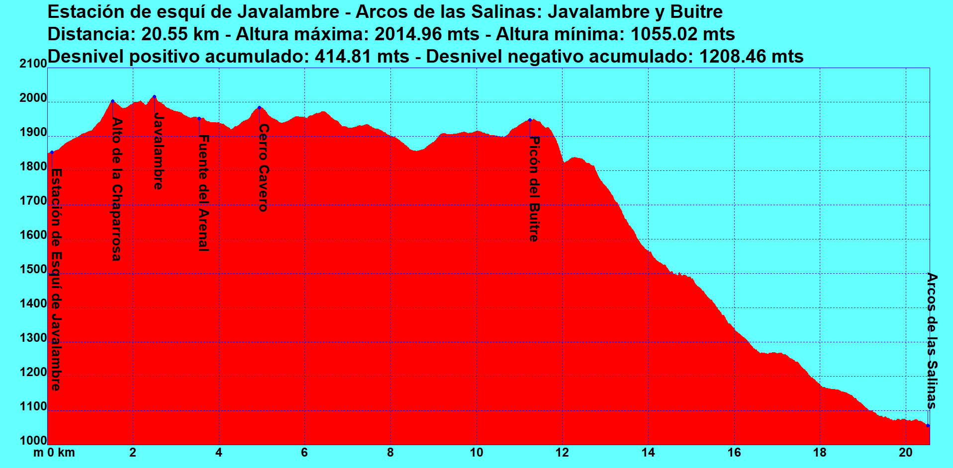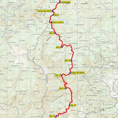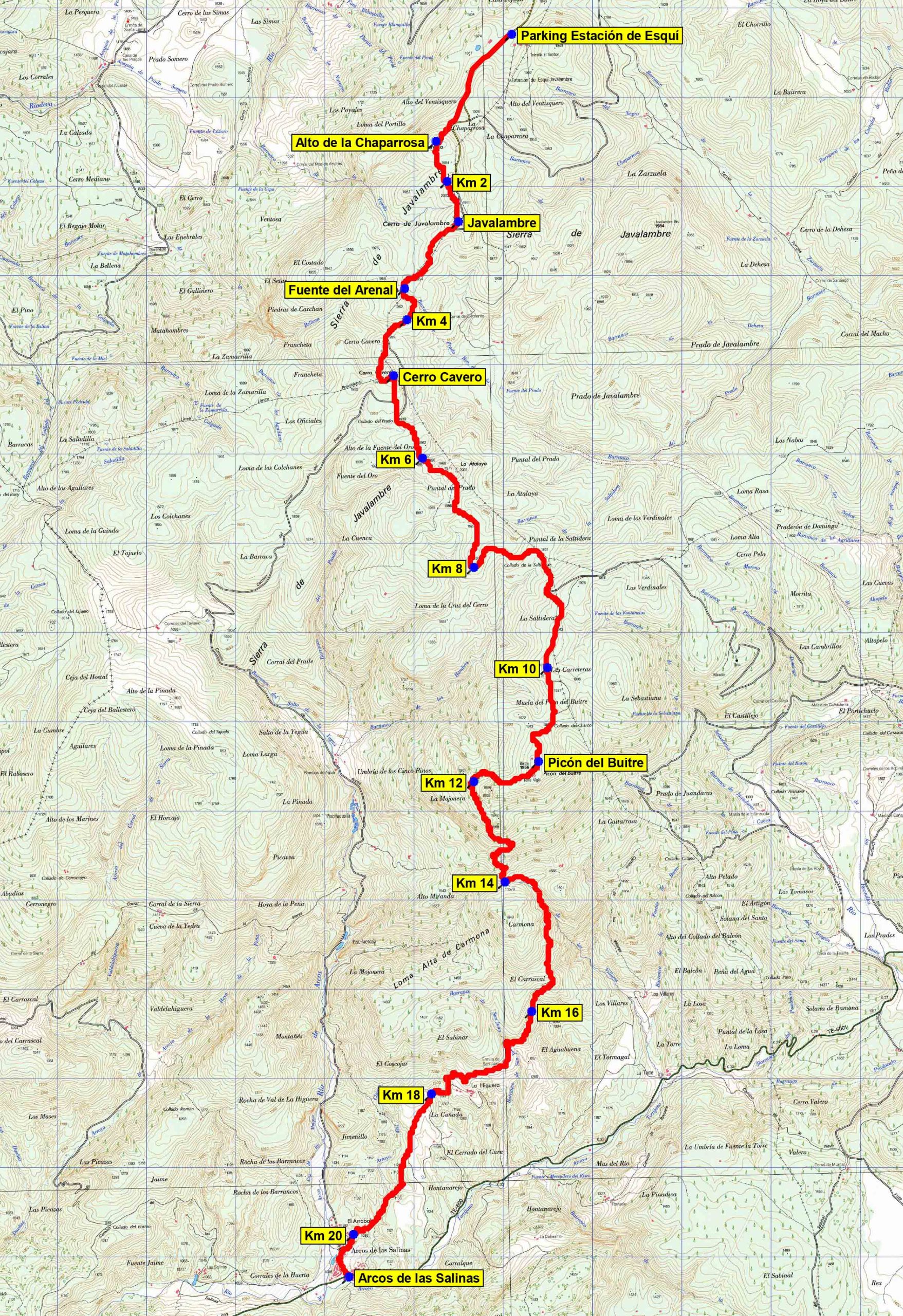 Comenzamos a caminar en el parking de la estación de esquí de Javalambre (1.670 m) subiendo por las pistas de esquí hasta el Alto de la Chaparrosa (2.005 m). Desde este alto, siguiendo en dirección Sur unos 500 m, llegamos a la antecima norte del Javalambre, donde están las instalaciones del repetidor de TV (km 2). Y en otros 500 m estamos en la cumbre del Javalambre (2.019 m), con dos construcciones de piedra; una con forma de zigurat de 3 alturas y a unos 10 m otro cuerpo cúbico de piedra como base del vértice geodésico.