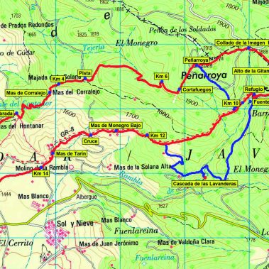 Continuamos la ruta recuperando de nuevo la dirección S, con la referencia del observatorio astrofísico del Buitre en el horizonte. Poco después del km 8 abandonamos en una curva el GR-10 por el que veníamos, que nos bajaría hasta Arcos de las Salinas por el río Arcos sin pasar por la cima del Buitre.