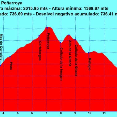 Durante el ascenso pasaremos por varias majadas o masías: Mas de la Solana, Mas del Corralejo… hoy en día abandonadas. Pasamos por varios terrenos en terrazas y algo de campo a través hasta conectar con una pista amplia, en ascenso por un denso pinar. La dejamos para girar a la izquierda (NE) por un cortafuegos que nos lleva hasta la cima del Peñarroya (2.028 m) y su enorme vértice geodésico en lo alto de una columna (con 12 grapas para subir). Hay también un mirador con vistas espectaculares junto a una mesa de orientación y un pluviómetro.