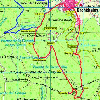 El camino sube junto al barranco de la Fuente del Hierro (SW), pasando junto a las fuentes “del Chorrillo”, “del Pilar” y “del Tío Pelús”. Posteriormente gira a la izquierda hacia el Portichuelo rodeando las Canalizas, cruza la carretera que va de Bronchales a la Fuente del Canto y el Puerto de Orihuela, y continúa ascendiendo (SE) hasta poco antes de la cima, donde el sendero confluye con el itinerario que viene de Fombuena (panel indicador) y que cogeremos luego para regresar a Bronchales.