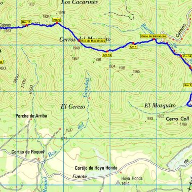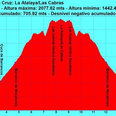 Retrocederemos hacia Piedra de la Lobera y entre matojos y pinos aislados, llegaremos al Vértice de las Cabras (2080 m). Ahora crestearemos un poco (O) por el cordal del Mosquito para comenzar a descender por el barranco de Mocalones. Poco después encontramos una pista, que seguimos hasta el cortijo del Mosquito. Continuaremos descendiendo por la pista durante unos dos kilómetro y medio para llegar al Bus.