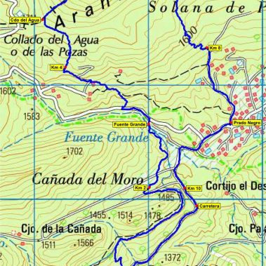 Seguiremos cerca de su cauce durante casi 6 kilómetros, en suave ascenso lo cruzaremos en varias ocasiones coincidiendo con un sendero señalizado local. Pasaremos junto a las ruinas del cortijo de la Fábrica de Pardo, lugar donde el camino que llevamos se tornará en sendero, a veces casi imperceptible pero que transcurre junto a una preciosa chopera