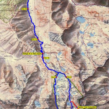 Llegaremos a una serie de estanques y lagunillas que bordearemos por el camino balizado con numerosos hitos hasta alcanzar una conducción de aguas tapada con losas de hormigón sobre las que continuaremos el camino, en breve llegaremos a una pequeña presa y el camino comenzará a ascender fuertemente entre pedreras y grandes bloques hasta salir a la cuenca de los Lacs Verts (2.620 m.). Así llegaremos a los lagos de Maniportet y al Lac Bleu (2.657 m.), para subir al Turón remontaremos los canchales del Col de Coume Estrète, una pequeña trepada donde sólo hay que apoyar las manos nos llevará a la pendiente superior.