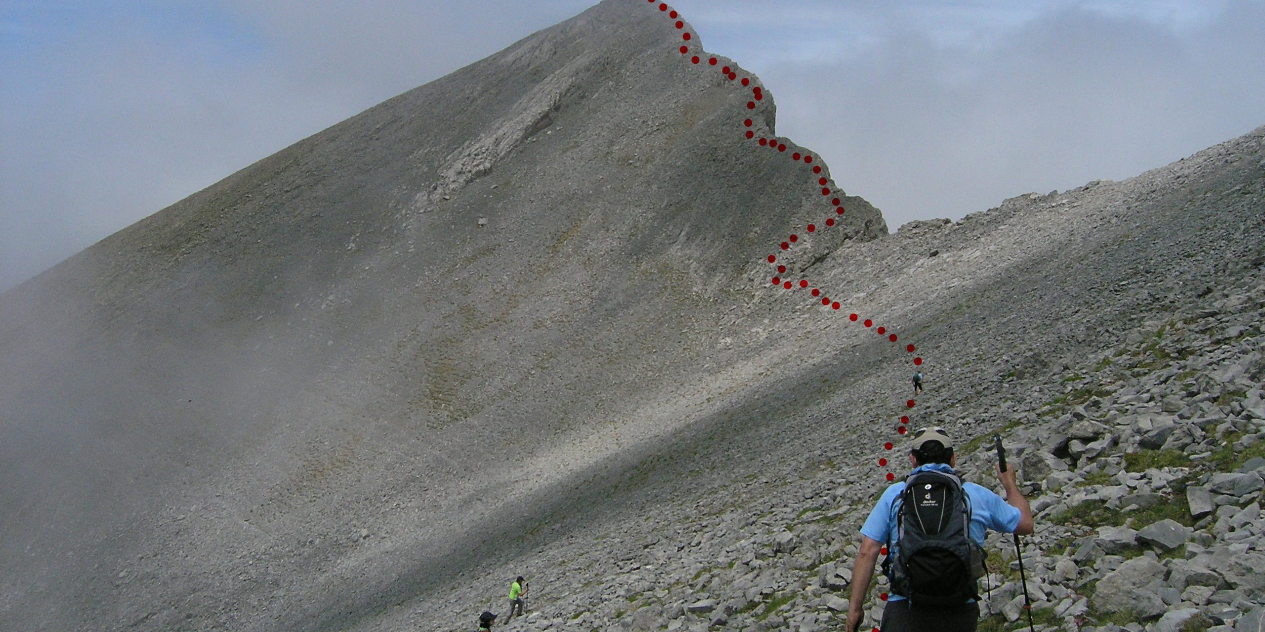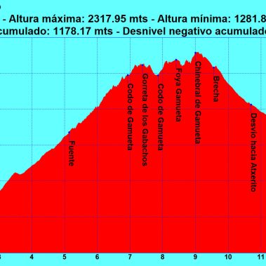 La senda nos llevará ascendiendo hacia la ladera de la derecha para alcanzar el collado de Gamueta (2.187 m). Hacia el S. buscaremos la senda que alcanza una pequeña canaleta rocosa, que precisa un mínimo apoyo de las manos (F) para alcanzar la cima.