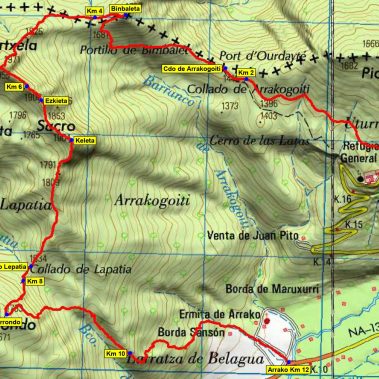 Esta entrada conduce a una borda, dando paso a un sendero que cruza el pastizal hacia un pequeño hombro (1.393 m), dejando a la izquierda el cerro de las Latas (1.403 m), y elevándose acto seguido al collado Arrakogoiti o puerto de Urdaite (1.416 m), muga núm. 255.