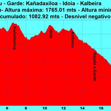 Continuaremos el recorrido descendiendo al próximo collado (1.630 m) y desde aquí comenzaremos el descenso por el Barranco de Ganbuluzea hasta desembocar en la carretera de Garde a Ansó y finalmente caminando kilómetro y medio por la carretera llegaremos a Garde (754 m), donde nos estará esperando el Bus
