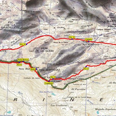 Continuaremos por la cresta para dirigirnos al Col d’ Anéou (2.245 m), y una vez en él, nos desviaremos a la izquierda, efectuando un pequeño rodeo para comenzar a remontar la vertiente S. de la montaña por terreno empinado. Aunque existe un marcado sendero que desemboca al W. de la cima, nosotros llegaremos a ésta por un pequeño tramo de cresta. Cima del Anéou (2.364 m). Pequeño monolito de piedras. Seguiremos recorriendo el cordal por un sendero que evita los tramos más escabrosos de la cresta hasta alcanzar nuestro siguiente objetivo, la cima del Peña Blanca (2.365 m). Monolito de piedras. Techo del Circo d’ Anéou