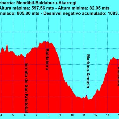 Con la referencia de las marcas amarillas y blancas seguiremos en descenso hasta llegar a las cercanías del caserío Barandika. Tomaremos una ancha pista de tierra que enseguida se torna a carretil cementado antes de llegar a la ermita de San Cristóbal. Continuaremos ascendiendo por una antigua calzada hasta llegar a un collado. Lo abandonamos por la derecha y caminando por senda llegaremos a la cumbre de Baldaburu (469 m). Vértice y buzón montañero.