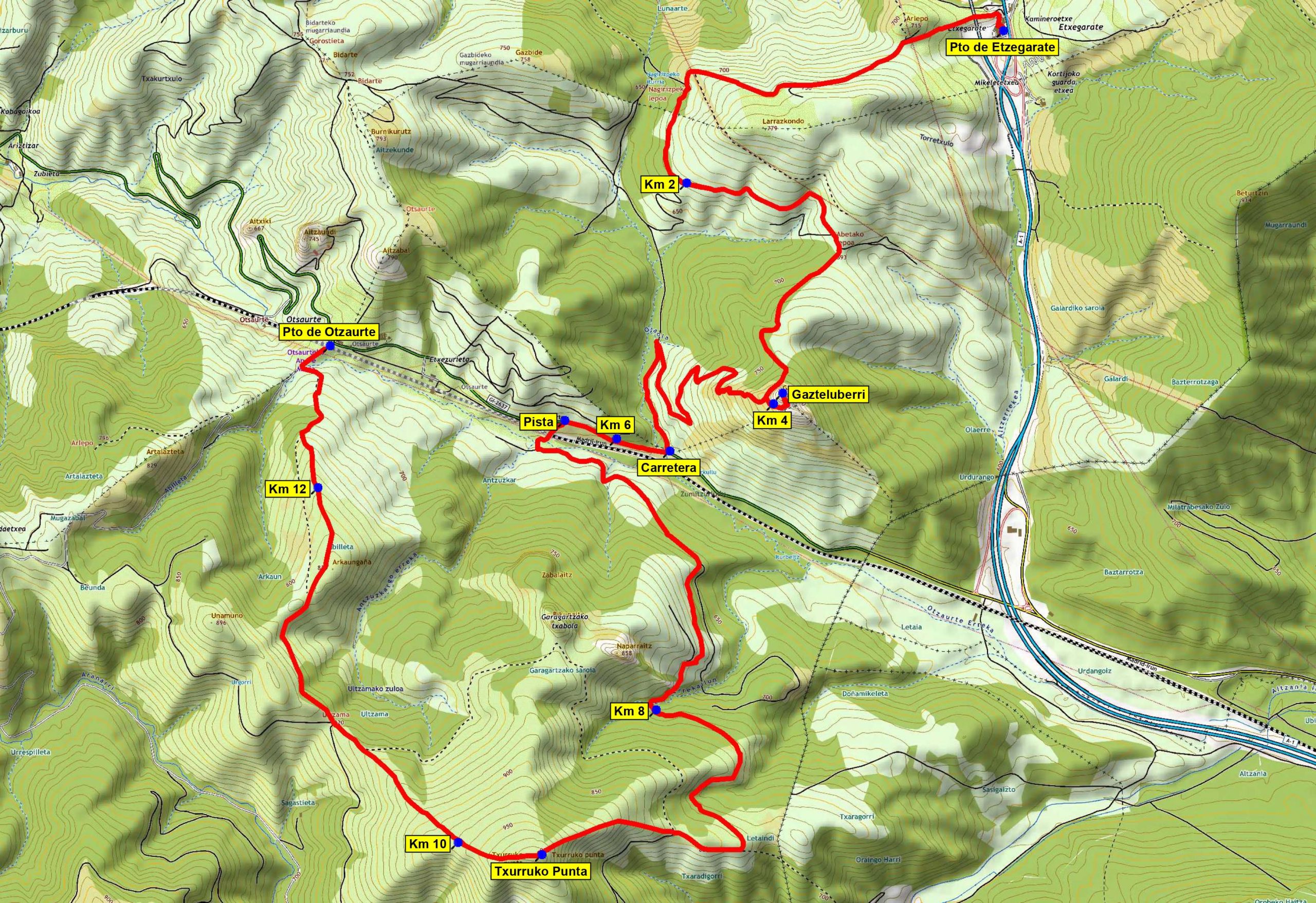 Desde la depresión que separa las dos peñas, donde está situada la antena (835 m), afrontamos el descenso por un hayedo y plantaciones de alerces hasta llegar a una pista que penetra en la barrancada de Ojaola. La seguimos por la izquierda (S) y en breve llegamos a la carretera que viene desde Altsasu (SE). Giramos a la derecha y continuamos por ella 1,5 km (NW) en dirección al Pto. de Otzaurte antes de salirnos por una pista a la izquierda (SW) que nos permite cruzar la línea férrea Madrid-Hendaia y el arroyo Otzaurte antes de girar a la izquierda (SE) para subir al Txurruko Punta.