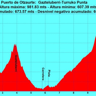 Vamos faldeando, en suave ascenso por su vertiente E, las peñas Naparaitz (860 m) y Zabalaitz (868 m), llamadas Garagartzako Harriak, de impresionante aspecto. Poco antes del Km 9, cuando nos asomamos ya al embalse de Urdalur sobre la vertiente S, giramos a la derecha (W) para afrontar el último tramo de subida en fuerte repecho hasta la cima de Txurruko Punta (991 m), con buzón y vértice geodésico.