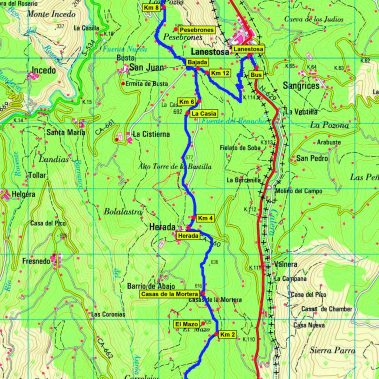 Descendemos por el mismo camino de subida hasta las Majadas del Haya para afrontar ahora el pronunciado descenso, por pista cementada de nuevo, que en un par de km nos lleva a Lanestosa (289 m), final de nuestra ruta. Al salir a la carretera N-629 giramos a la derecha para seguirla unos 300 m en dirección S hacia el Puerto de los Tornos, hasta el lugar donde estará el bus junto a la piscina municipal.