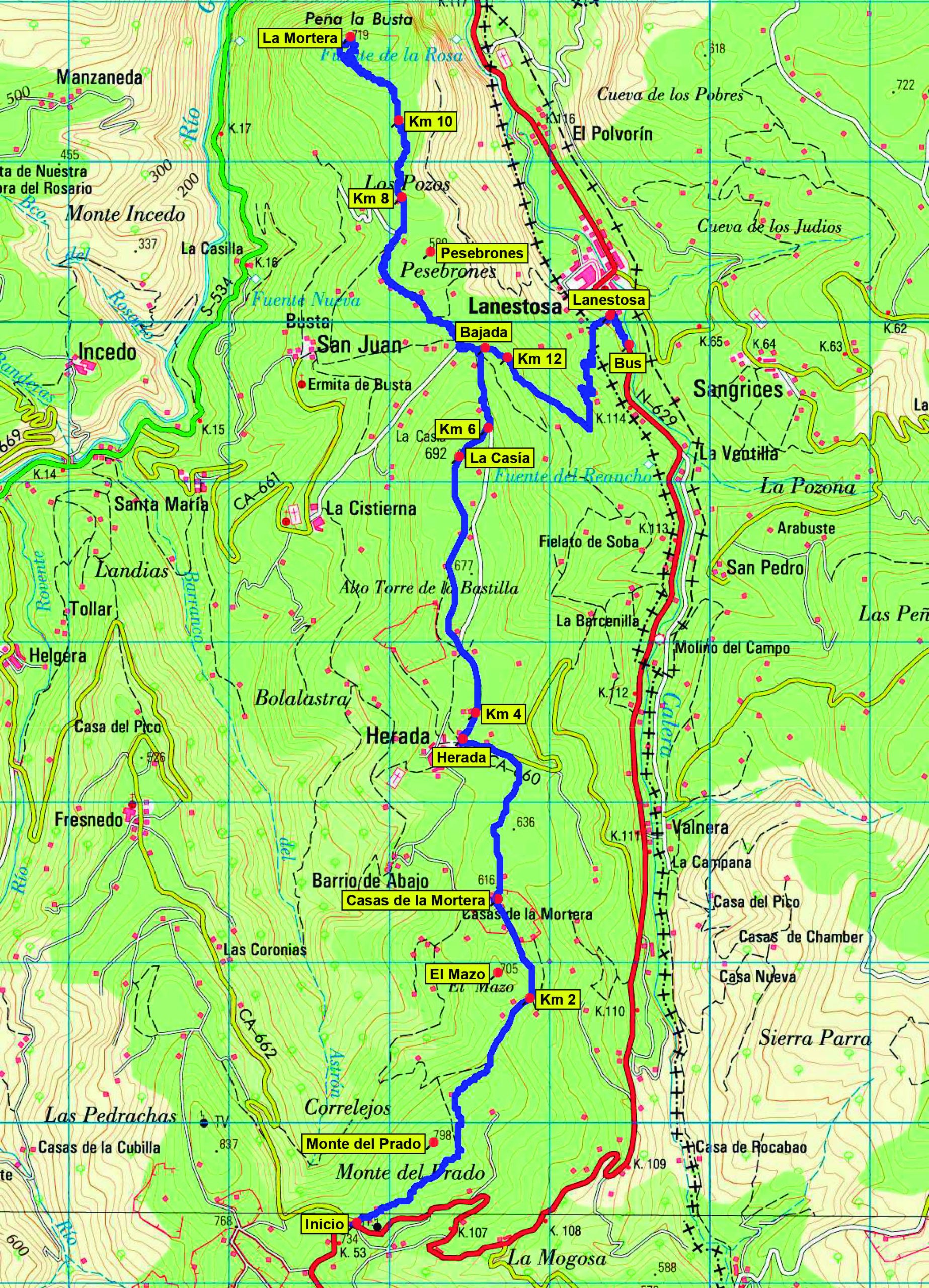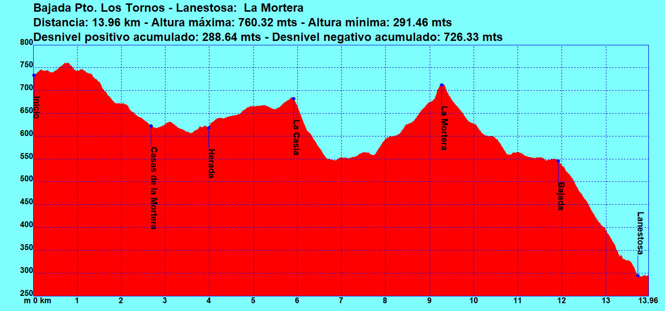 Descendemos por el mismo camino de subida hasta las Majadas del Haya para afrontar ahora el pronunciado descenso, por pista cementada de nuevo, que en un par de km nos lleva a Lanestosa (289 m), final de nuestra ruta. Al salir a la carretera N-629 giramos a la derecha para seguirla unos 300 m en dirección S hacia el Puerto de los Tornos, hasta el lugar donde estará el bus junto a la piscina municipal.