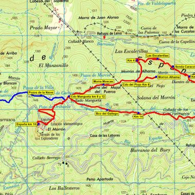 De nuevo en los Llanos, progresamos unos metros y, cuando el sendero comienza a descender hacia el Collado Blanco (1.228 m), giraremos a la izquierda para coronar la Morra de las Moscas (1.502 m). Descenderemos por la vertiente opuesta, un sendero marcado con hitos nos lleva al Collado Mangueta (1.383 m),