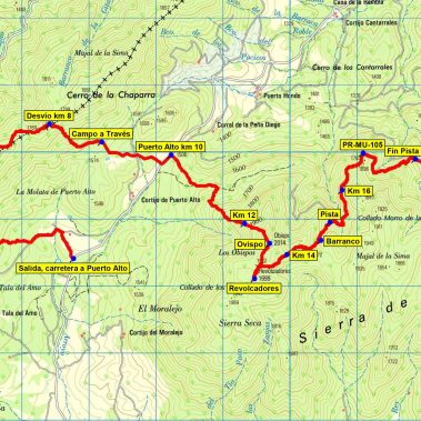 Continuaremos el recorrido retrocediendo unos metros hasta llegar a ver las marcas del PR-MU-105, las cuales nos acompañarán hasta el final de nuestro recorrido
