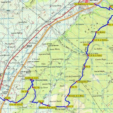 Atravesando una zona en la que puede haber ganado suelto llegaremos al Coll de la Selleta (508 m). Seguiremos avanzando por el ondulado cordal de la sierra sobrepasando varios hitos de piedra que señalan el límite administrativo entre Peñíscola y Santa Magdalena de Pulpis, hasta llegar al estratégico Coll de la Palma (527 m).