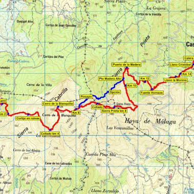 Para dirigimos a la cumbre continuaremos el descenso hasta el collado (1.314 m) que separa ambas sierras y límites municipales. Ahora en duro ascenso sin camino y con alguna que otra trepada sin gran dificultad llegaremos a una pequeña meseta en cuyo extremo se encuentra el vértice geodésico de Sierra Prieta (1.518 m). El descenso se realiza por la vertiente que da a Casarabonela hasta el Puerto de Las Maderas donde se retoma el recorrido común a los que no han subido a la cima.