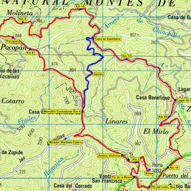 Retrocederemos hasta el cruce y descenderemos hasta el Monolito de las Contadoras, aquí tomaremos la pista de la derecha que nos conducirá has el alto y mirador de Pocopán (849 m). Impresionantes vistas del Parque Natural de Málaga. Continuaremos descendiendo hasta llegar a un cruce, aquí giraremos a nuestra izquierda y por buen camino llegaremos hasta la Casa de Santillana, que se encuentra completamente en ruinas y que parece haberse mimetizado con el entorno.