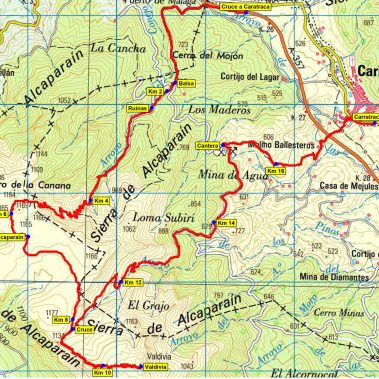 comenzaremos a caminar por una pista que empieza junto a un pequeño aparcamiento a la orilla de la A-357 en las inmediaciones de Carratraca. Al poco tiempo encontramos alguna baliza del GR-249 «Gran Senda de Málaga». Llegaremos a unos cipreses junto a los que hay un cartelón en el que se indica que nos encontramos en el Monte Público de Alcaparaín. Continuaremos ascendiendo por la pista de tierra en perfecto estado, la cual coincide con el trazado del camino conocido como de La Chilita.