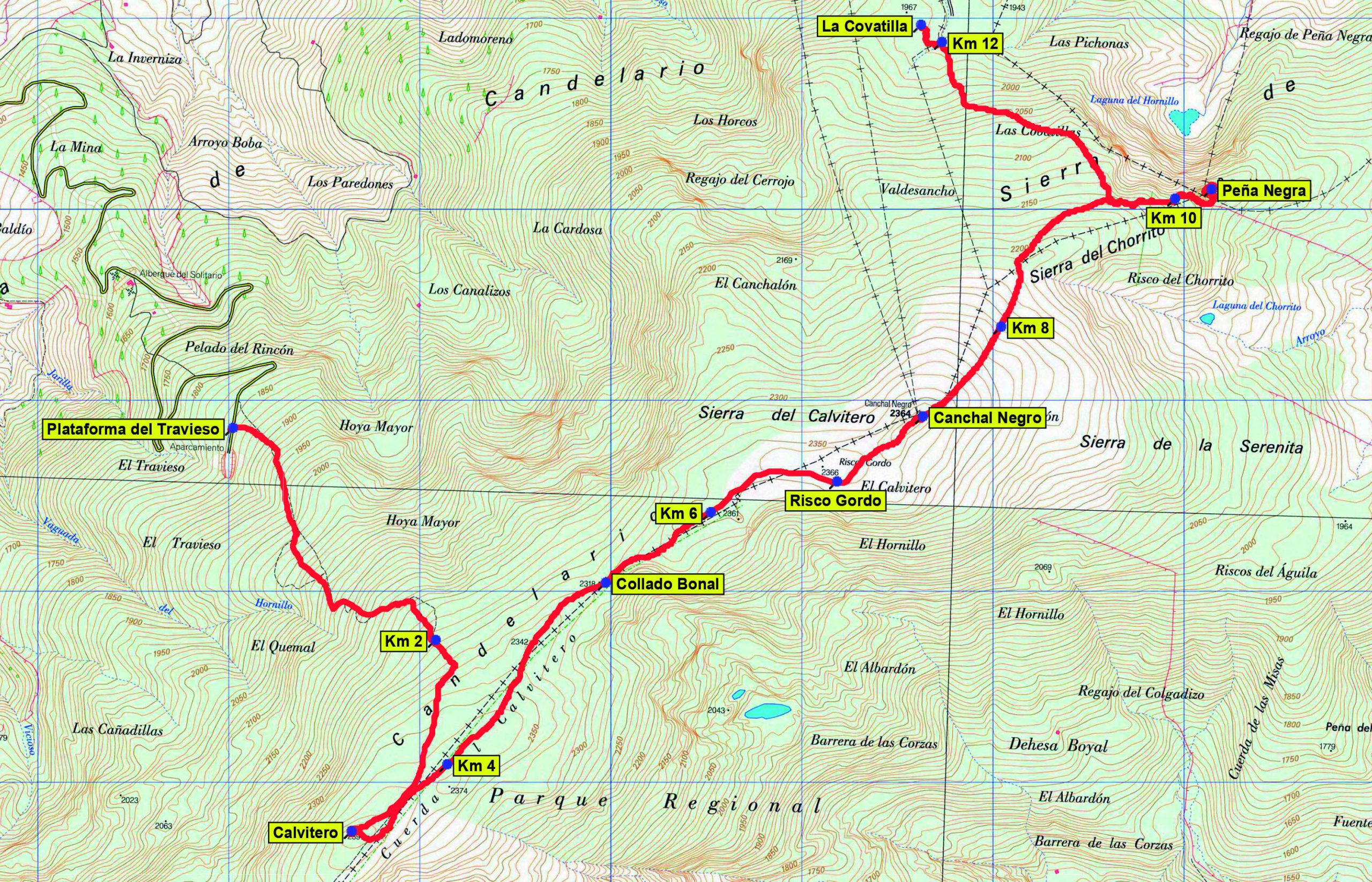 Desde el Alto del Puertecito seguimos hacia el N por la pista del cordal de la pequeña sierra paralela al cordal principal del Calvitero que nos dirige hacia Peña Negra por terreno forestal, atravesando un par de portelas y pasando junto a varios pilones de agua hasta alcanzar (ya convertida en sendero) la encrucijada situada bajo Peña Negra (1.635 m). La cima, con una caseta de vigilancia forestal y vértice geodésico, se consigue por la derecha con una pequeña y fácil trepada. A esta encrucijada llega también el itinerario que sube directamente desde el Puerto de Béjar.