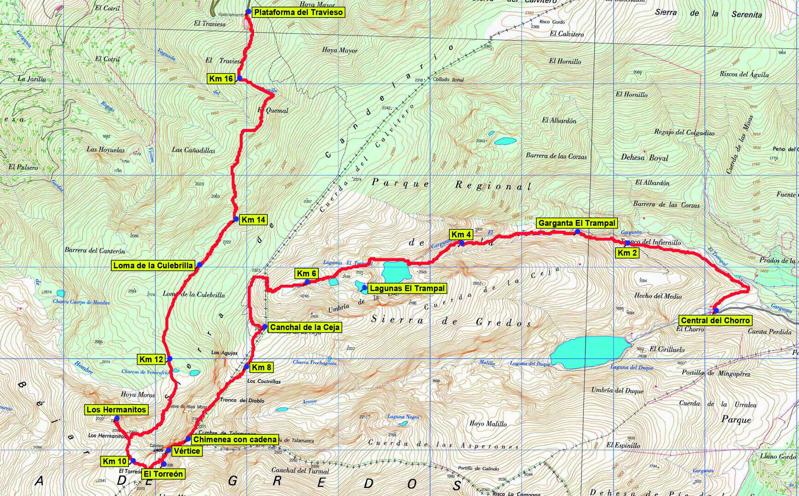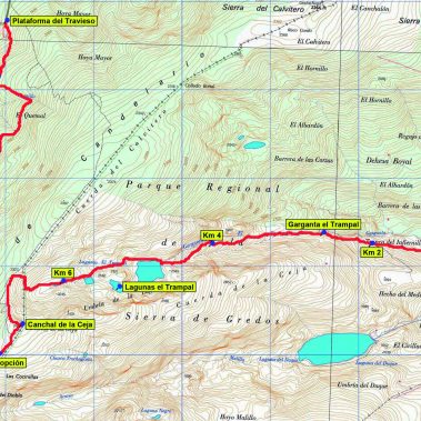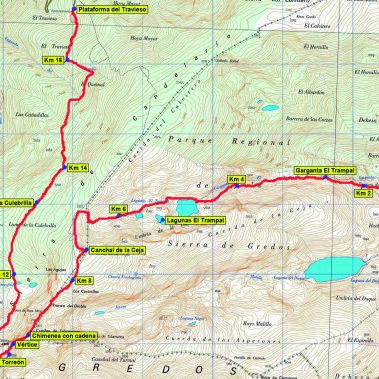 Perdemos altura encaminándonos hacia el Torreón, dejando a la derecha (a la altura de las elegantes agujas) el desvío hacia el N que baja directamente a la Plataforma del Travieso. El terreno se vuelve abrupto tras la ante cima del Alto de Talamanca (2.308 m) hay que destrepar el “Tranco del Diablo” por una chimenea en buena roca equipada con cadena (II), o perder 50 m de desnivel para rodear por un corredor señalizado. Superado el obstáculo se alcanza la torreta del vértice geodésico del Calvitero, 100 m antes de llegar al Torreón (2.400 m), techo de la provincia de Cáceres.