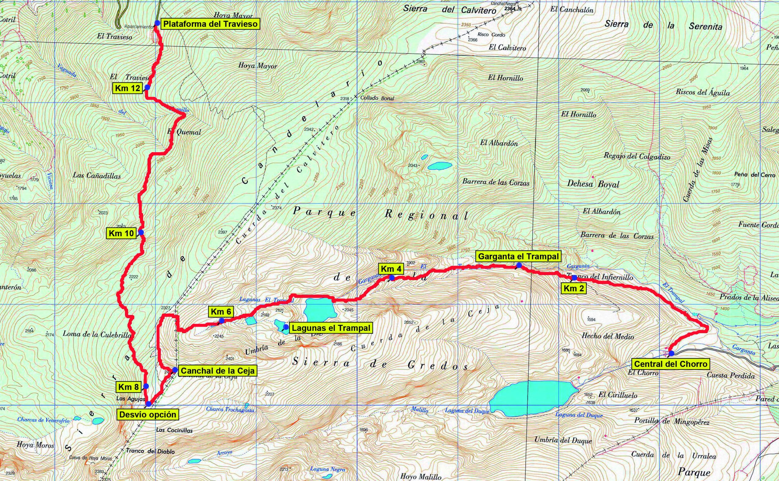 Seguidamente descendemos hacia la Hoya Moros por bloques de granito sin bajar hasta las praderas inferiores. Por las charcas de Venero Frío (2.100 m), donde surge el río Cuerpo de Hombre, seguimos dirección N sobrepasando la Loma de la Culebrilla (2.220 m). Progresando bajo la línea de cumbres por terreno de rocas y piornos vamos descendiendo hasta llegar a la Plataforma del Travieso (1.862 m), en cuyo aparcamiento estará el bus.
