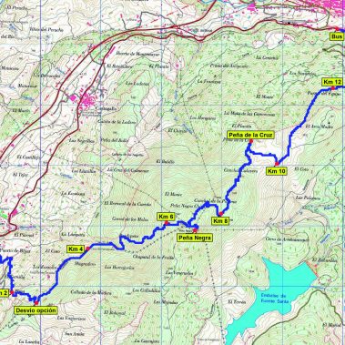 En la zona de pistas, aunque hay un camino con hitos junto a la valla, los piornos dificultan mucho la bajada. Es preferible entrar en las pistas y seguirlas casi hasta el edificio principal, intentando eludir las vallas de madera para llegar finalmente al amplio parking donde estará el bus esperando.