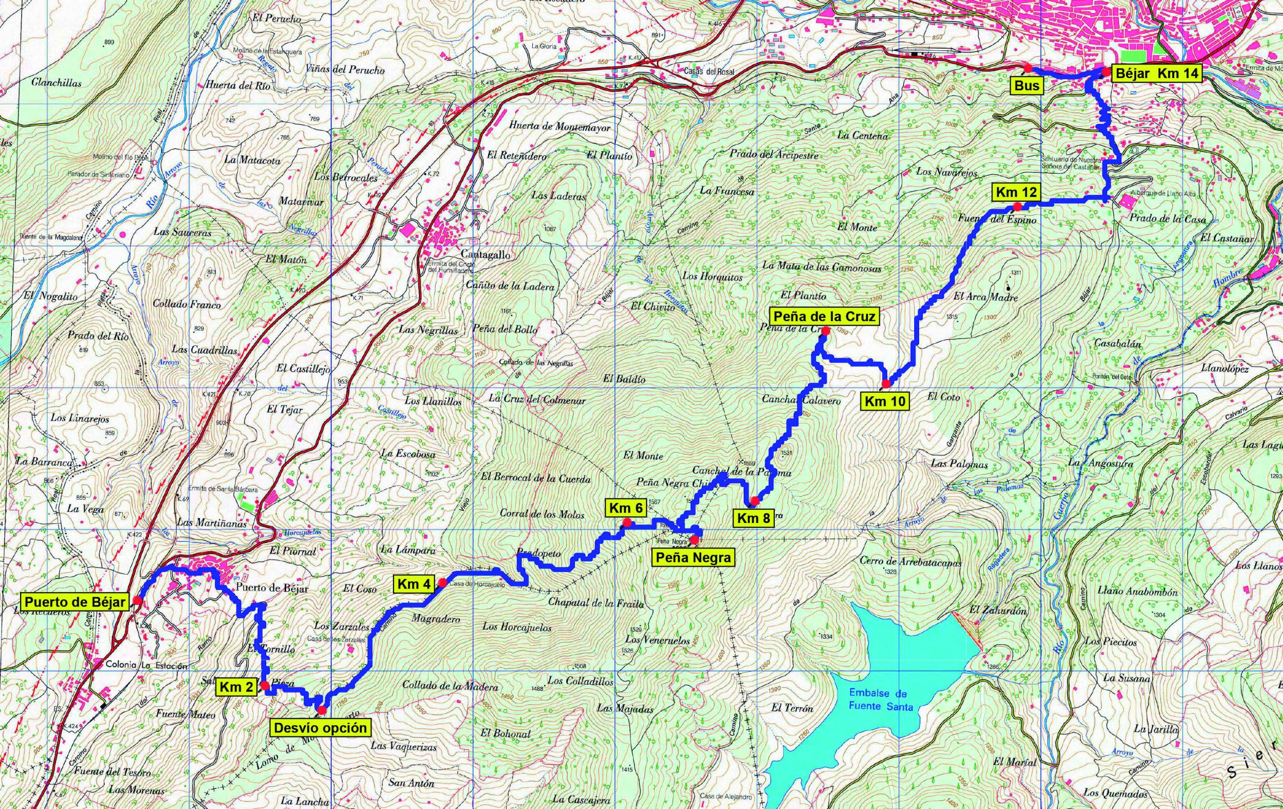 Ya solo nos queda descender por polvorienta pista hasta el albergue juvenil de Llano Alto (1.157 m) y, tras pasar 1 km después por la ermita del Castañar, desembocar en la carretera N-630-a que atraviesa la industriosa ciudad de Béjar (920 m). La seguimos unos 500 m por la izquierda (O) hasta una zona de almacenes junto a la carretera donde estará el bus esperando.