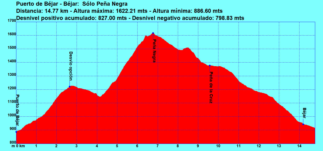salimos de Puerto de Béjar (920 m) por la llamada “Ruta de San Antonio” en subida hasta casi el km 3, donde se puede coger el desvío que sube directamente hasta Peña Negra sin ir hasta la Cruz de Jeromo.