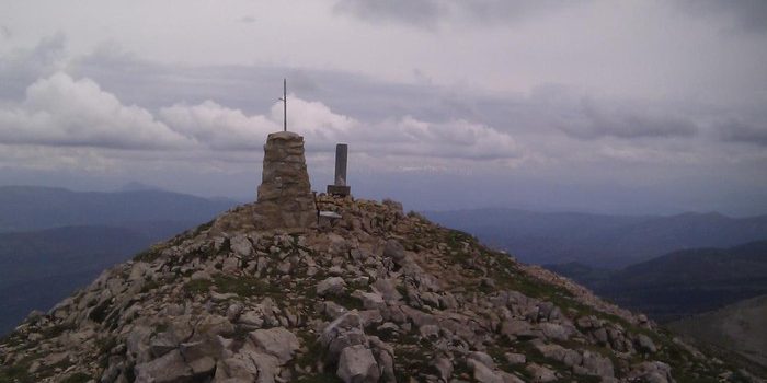 Tras otro collado con un amplio prado seguimos de “frente-izquierda” los hitos entre matojos de enebro en fuerte subida, con un par de resaltes en los que hay que apoyar las manos en roca caliza. La fuerte pendiente se mantiene ya hasta la cima. Cruzamos una pedriza y tras otro pequeño resalte accedemos a la cima del Tozal de Guara (2.078 m), con una cruz sobre torre de piedras y vértice geodésico. Curiosa vista hacia el Sur, con las cicatrices de los cañones y frontera muy nítida entre la zona montañosa totalmente cubierta de bosque y el llano completamente despejado. Excelentes vistas hacia Pirineos en el Norte: Monte Perdido, Possets, Aneto, Bisaurín, Retona…