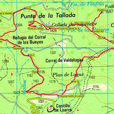 Los montañeros pueden descender por la ruta siguiente. Por el collado del repetidor y la cresta W. La ruta se inicia en el mismo lugar, pero en el primer cruce dentro del pinar tomamos ahora la señal de Rasal. De esta forma se bordea un cabezo con cortafuegos hasta una campa con un corral. Al otro lado de la campa las estacas del P.R. nos llevan al pinar donde se encuentra una nueva bifurcación. No tomaremos la señal que indica Pusilibro, a no ser que queramos evitar directamente la cresta, ya que nos llevaría justo al lugar donde termina, por lo que nuevamente seguimos hacia Rasal alcanzando, por la pista, el collado con el repetidor (1.428 m). A la derecha de él, en una zona desbrozada, buscamos los cairns que nos indican el giro a la derecha (E)