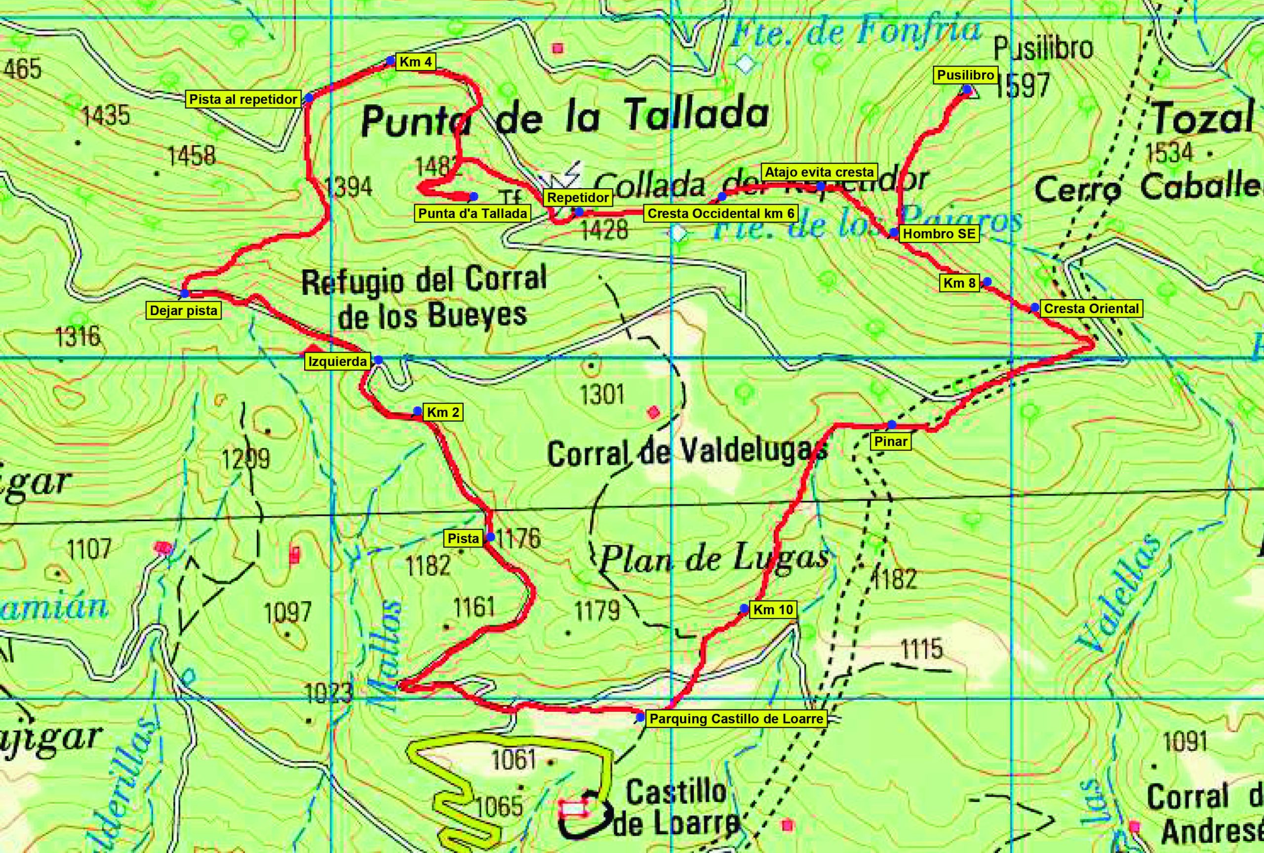 Los montañeros pueden descender por la ruta siguiente. Por el collado del repetidor y la cresta W. La ruta se inicia en el mismo lugar, pero en el primer cruce dentro del pinar tomamos ahora la señal de Rasal. De esta forma se bordea un cabezo con cortafuegos hasta una campa con un corral. Al otro lado de la campa las estacas del P.R. nos llevan al pinar donde se encuentra una nueva bifurcación. No tomaremos la señal que indica Pusilibro, a no ser que queramos evitar directamente la cresta, ya que nos llevaría justo al lugar donde termina, por lo que nuevamente seguimos hacia Rasal alcanzando, por la pista, el collado con el repetidor (1.428 m). A la derecha de él, en una zona desbrozada, buscamos los cairns que nos indican el giro a la derecha (E)