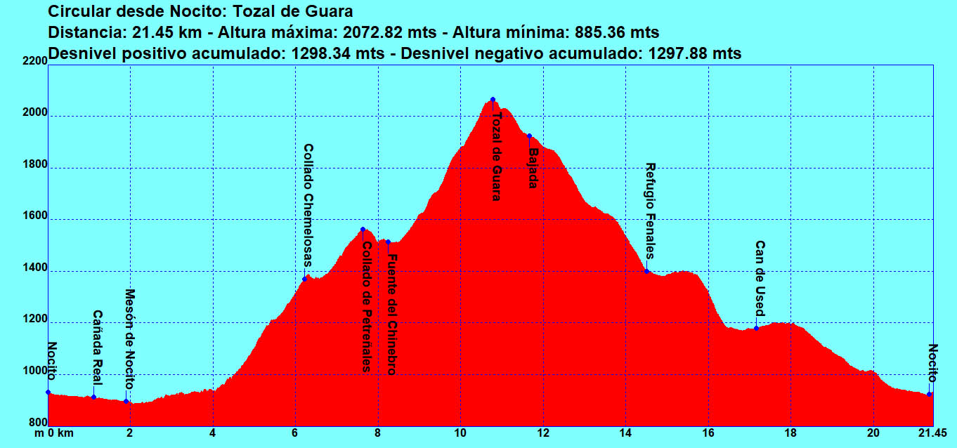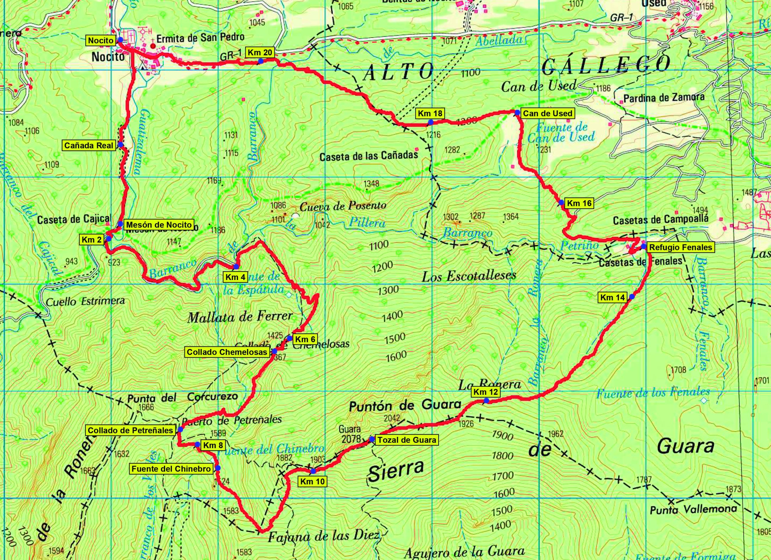 Para seguir la travesía descendemos la cresta oriental. En una pequeña cota (1.967 m) dejamos el cresterío y el camino que sigue la loma para tomar una senda descendente marcada por un gran hito de piedras. Aunque Nocito quede hacia la izquierda, el sendero nos va desviando bastante a la derecha. Llegamos a una pista que seguimos a la izquierda y tras pasar junto al refugio de Fenales, donde hay una fuente, seguimos la pista en zigzag atentos a las indicaciones de los postes en un largo descenso hasta Nocito, donde nos estará esperando el autobús.