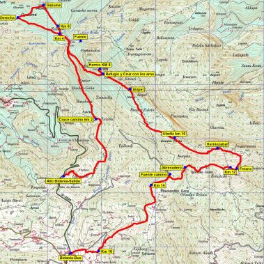 Comenzaremos el descenso, primero en dirección (E), por sendero y después en dirección (S), hasta llegar a una encrucijada de caminos. Aquí, a la altura de un fresno, giraremos decididamente a la derecha (O). Ahora tendremos que alcanzar la pista que nos llevará a Bidania, para ello pasaremos por la cima del Igorreko Gana (868 mts), y un abrevadero. Poco después llegaremos a una fuente situada ya en la pista. Sólo nos quedará caminar por ella durante media hora para llegar a Bidania, donde nos estará esperando el Bus.